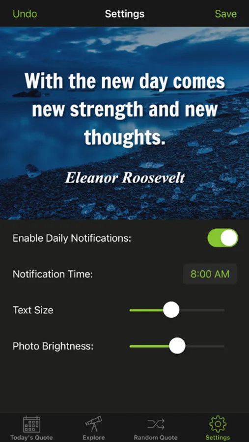 Get Today's Quote - our inspiring quote of the day - on your iPhone or iPad Notifications screen or your Home Screen. Use Settings to choose the time you prefer to receive the quote of the day and enjoy sharing our amazing picture quotes.
