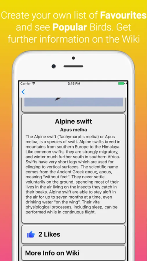 Search through and like your favourite birds for easy location later. See popular birds based on others' online feedback.