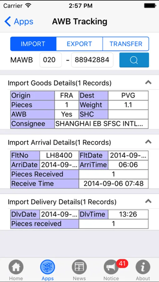 2 启动本应用程序并向本公司提供所需信息(如运单编号、航班编号等),您将获取相关货物运输情况、航班出进港情况。