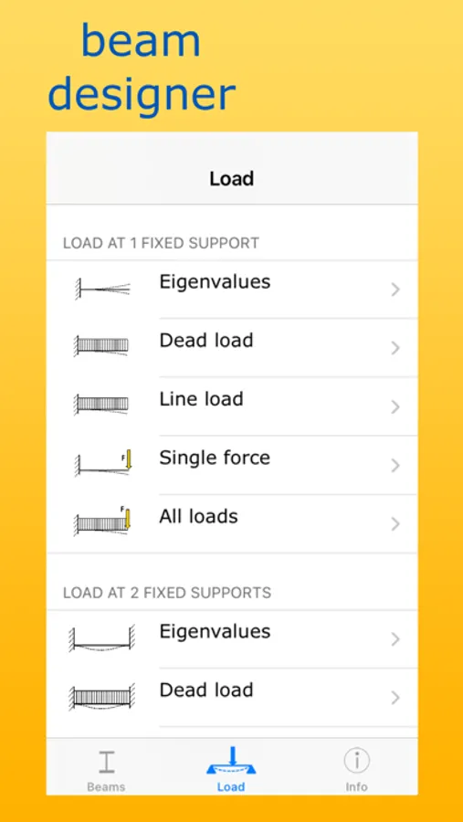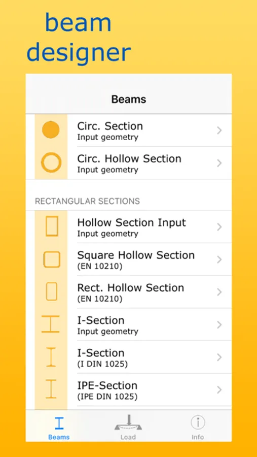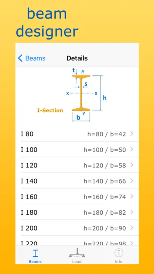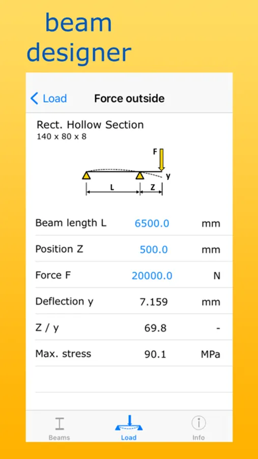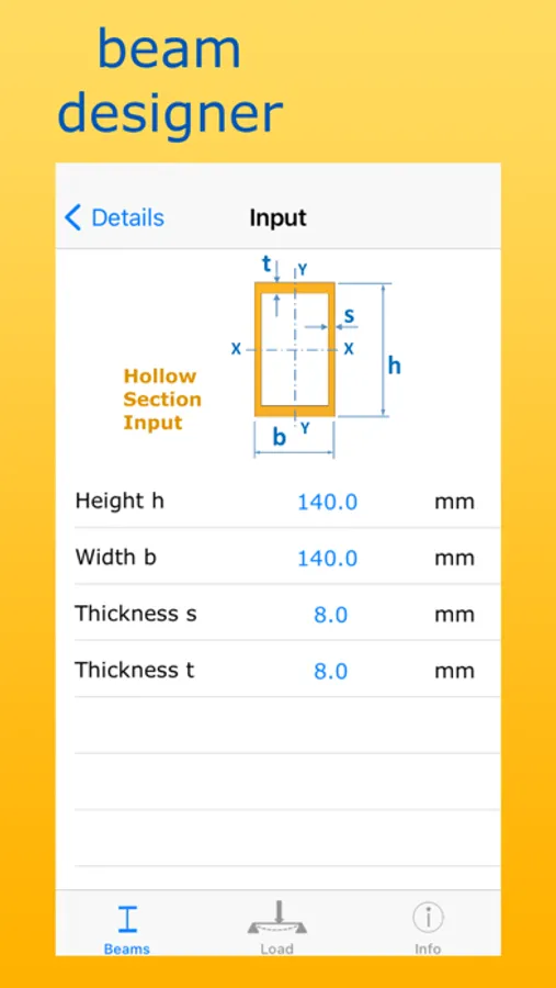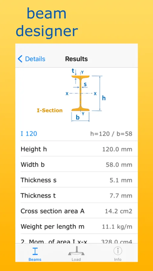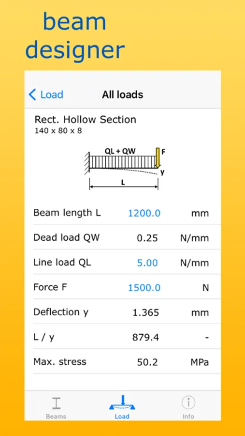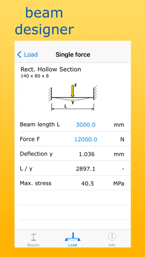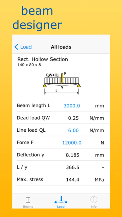 With this app you calculate the natural frequencies, deflections and stresses for many different european steel profiles in a very simple and intuitive way. Just select between different round and square hollow profiles or T-beams from the library or enter your own data. You get the important characteristic values for all profiles, from the cross-section to the moment of inertia.