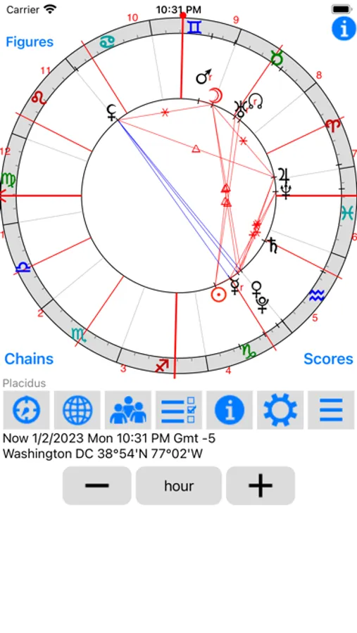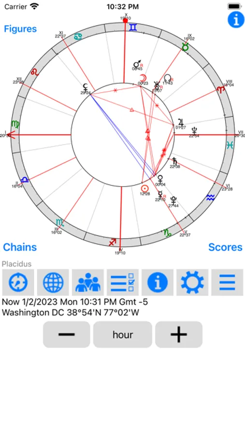 App contains essential and accidental scores table with the ability to customize the order of values calculation. There is a choice of 11 house systems, 20 types of aspect with customizable orbs and database of about 100000 places with specified time zones, so the difference with GMT is determined automatically, besides, you can add new place.