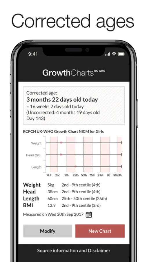 Growth Charts UK-WHO uses UK-specific growth chart data to allow health professionals to calculate growth centiles for infants and children. Calculate weight, height, length and BMI centiles, as well as quick calculations of corrected age for children born preterm.