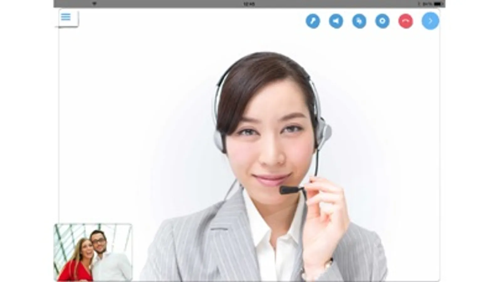 「みえる通訳」は、いつでもどこでもワンタッチで通訳オペレーターにつながり、お客様との接客をサポートする映像通訳サービスです。