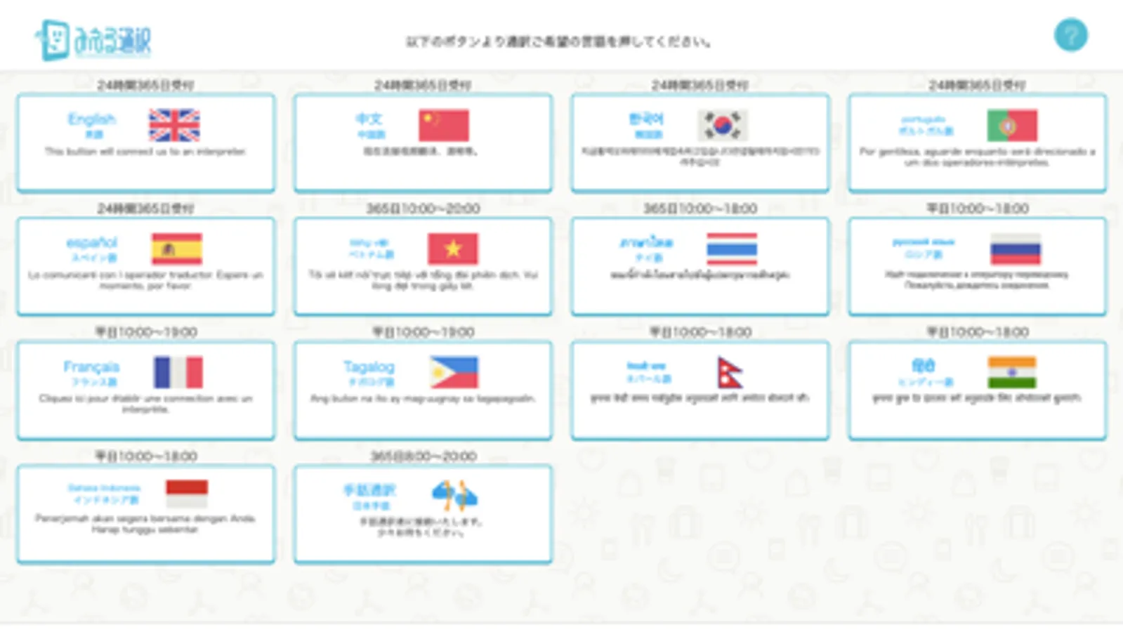 ・通訳コールセンターのご利用の集中により、通訳オペレーターと繋がるまでに少々お待ちいただく場合がございます。