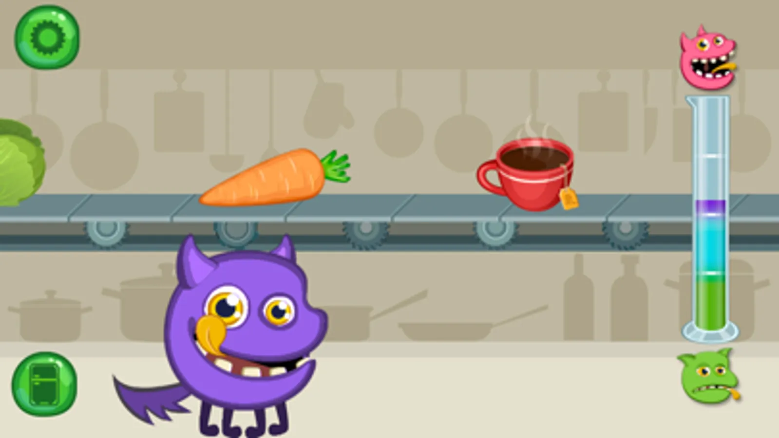 This game contains a variety of edible items that belong to 5 categories: vegetables, fruits, ready-to-eat food, drinks and desserts, but not all these products are equally healthy for Yum-Yum. There is beastie’s fridge in the game to check available and “frozen” products.