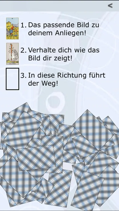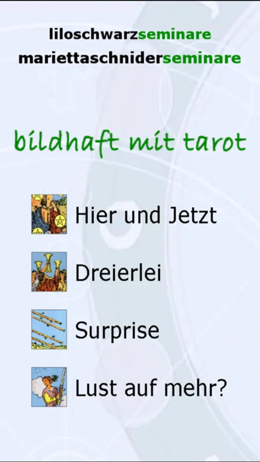 Es werden die klassischen Tarotkarten von Arthur Edward Waite, illustriert durch Pamela Colman Smith, verwendet. Sie dienen in anregender bildhafter Weise der Visualisierung persönlicher Gedanken und Anliegen, ermöglichen dadurch Reflexion, geben Feedback und fordern auch sinnvoll heraus. Und sie sollen die Spielfreude aktivieren.
