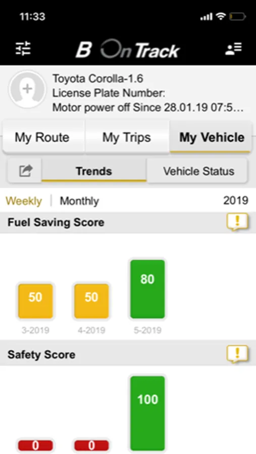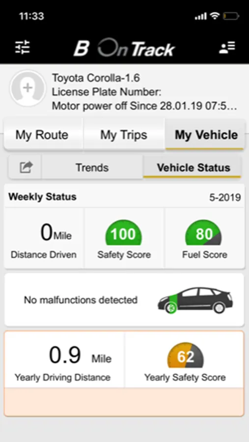 Following the installation on the vehicle, B On track Application lets you receive information regarding the vehicle you are driving and your driving habits. The application presents an analysis of the information that is received from the vehicle and lets you receive a daily and weekly feedback, in order for you to improve your driving habits, therefore causing to drive more safely, causing you to save and reduce the running costs.