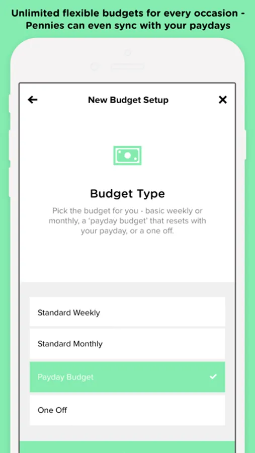 Pennies offers you weekly, monthly, bi-weekly, twice-monthly, custom and one-off budgets, that start on any day you want. No other budgeting app gives you this much flexibility to create budgets that work perfectly with your lifestyle.