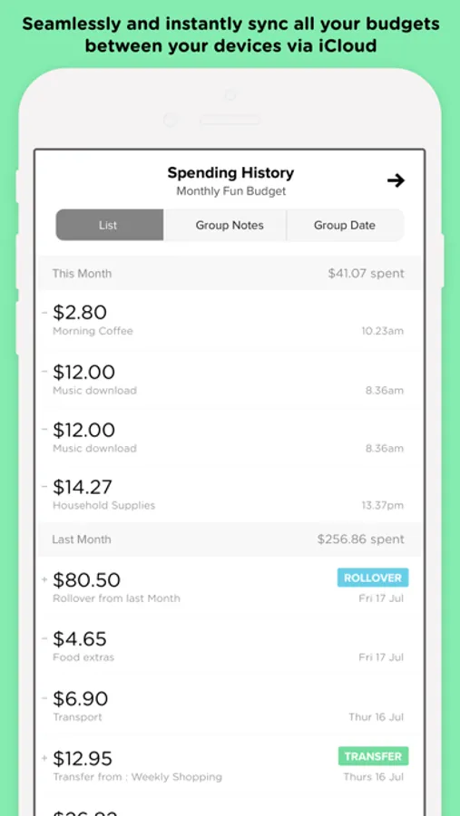 Keep your budgets backed up and shared across all your iOS devices via iCloud. Pennies installs on your iPhone, Watch and iPad and seamlessly syncs your budgets for you.