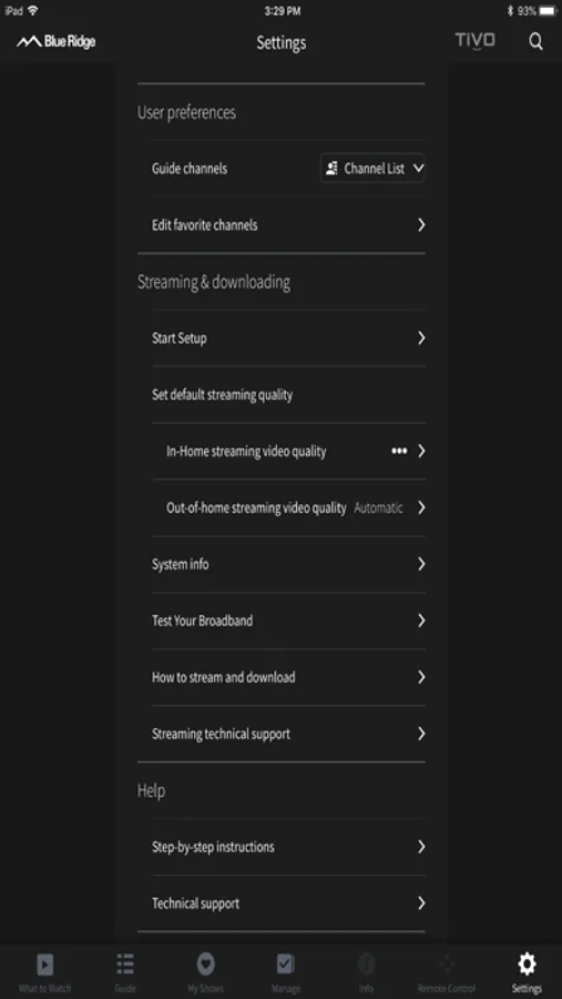 Features of the Blue Ridge Go app (some features are only available for Blue Ridge TiVo customers):