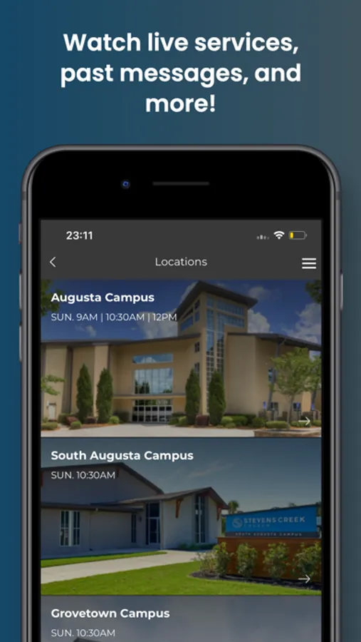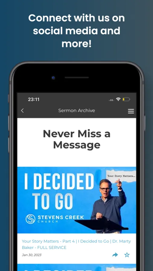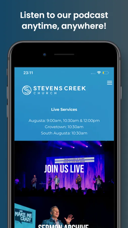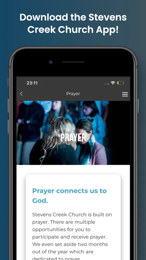 Download our Stevens Creek Church App! With our app, you can live stream our services, watch past messages, stay connected on all of our latest news and events, listen to our podcast, take message notes, pre-register your family, connect with us on social media, and tons more!