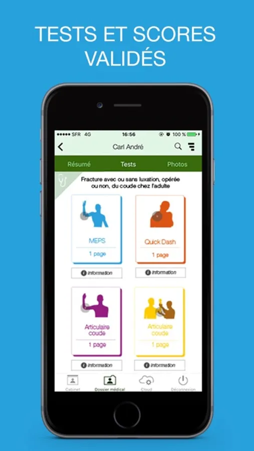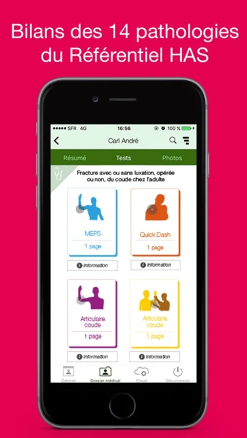 Vos bilans kiné en 3mn ! Bilans et tests scientifiques validés – lettre de synthèse – photos avec outils d’annotation – sauvegarde et partage Cloud – partage multi-appareil – interface web – bilans personnels