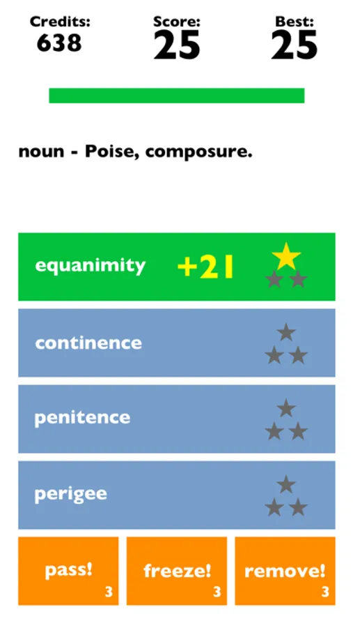 Get higher scores by using one of three power-ups - pass! to skip a word, freeze! to stop the timer, and remove! to eliminate one incorrect choice. Power-ups reactivate every 4 words of the same type you get right. Purchase power-ups with credits earned by answering correctly or swiping away incorrect words.