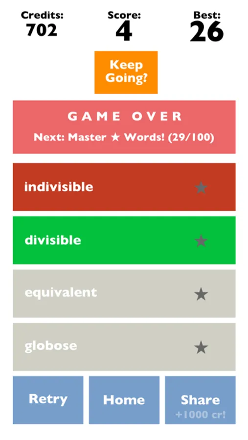 The rules are simple - tap the word that correctly matches the definition shown on the screen before time runs out, or swipe away incorrect words to get more time. The game is (virtually) endless - see how many vocabulary words you can correctly answer in a row.