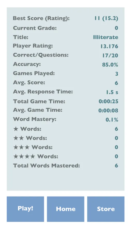 Advance through the 14 different grades of vocabulary mastery by accomplishing different challenges such as scoring a certain amount of points or mastering a number of words.