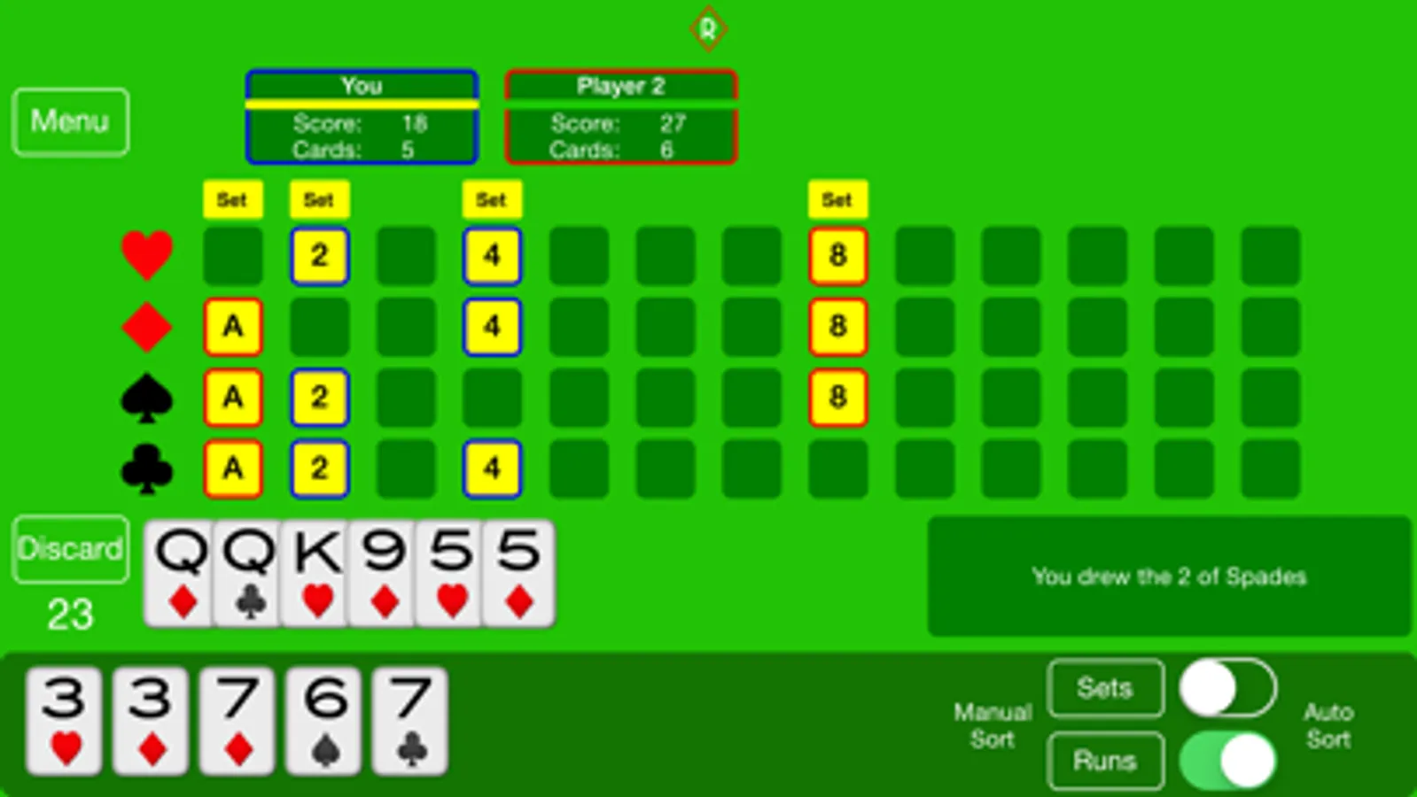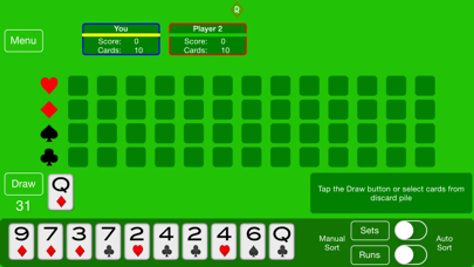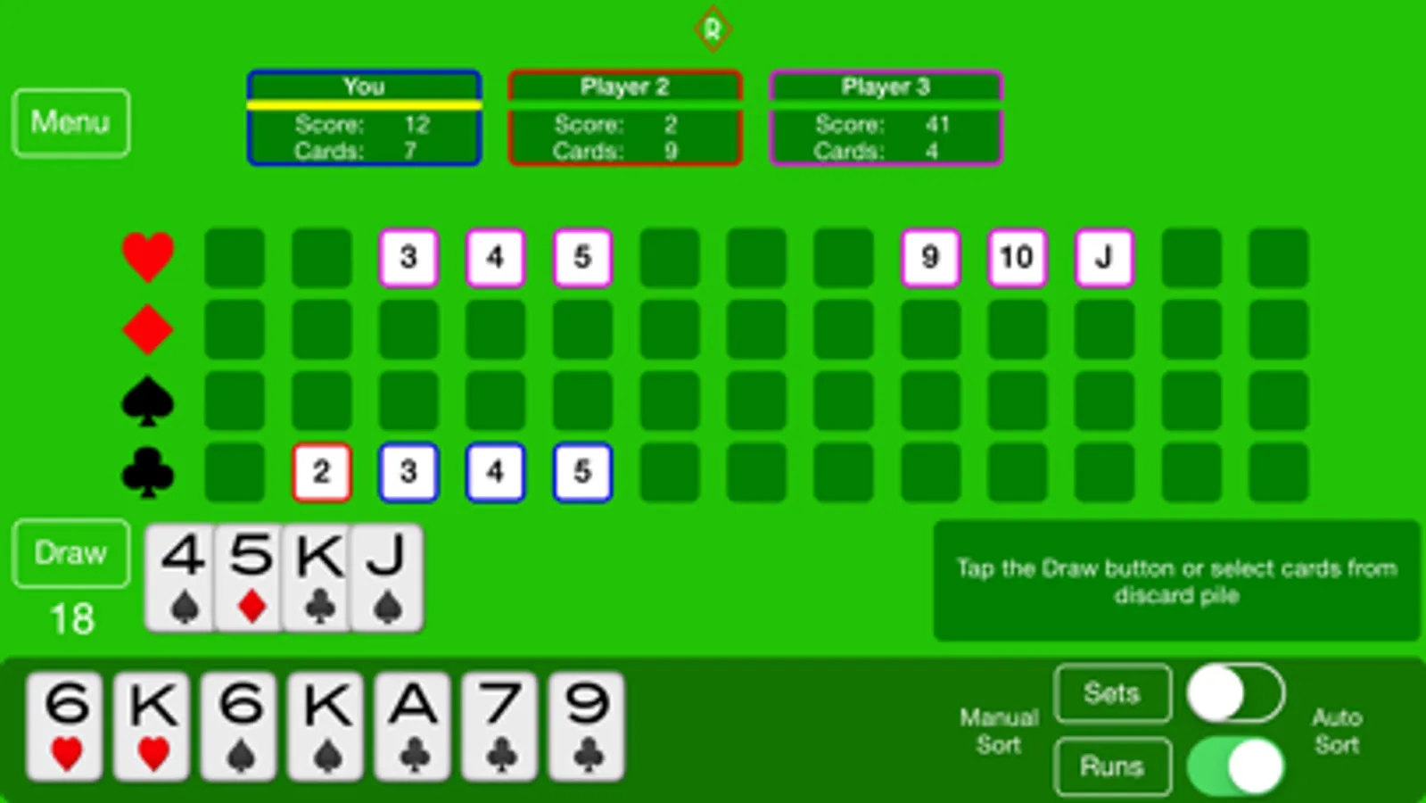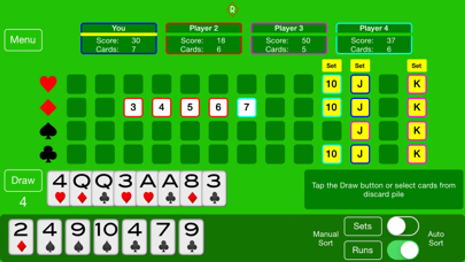 Classic Rummy is a game of making runs and sets of cards in the quest to get the most points. Our innovative played card grid makes it simple to see what has been played, and by whom. Our version is similar to 500 Rummy, where you can lay down runs and sets as you have them. Points for cards left in your hand when a player goes out are subtracted from your score.