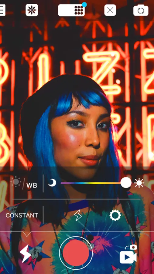 2. Capture a video or photo using flash or constant modes with options to toggle brightness and white balance