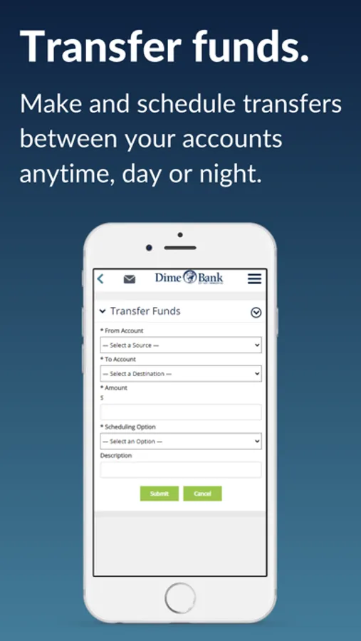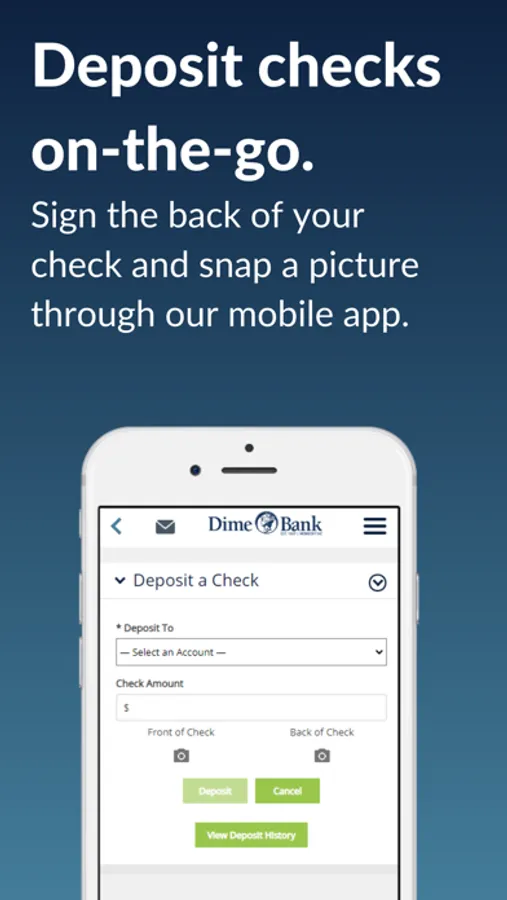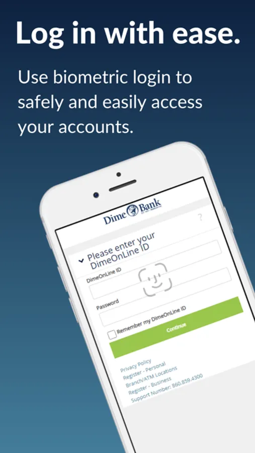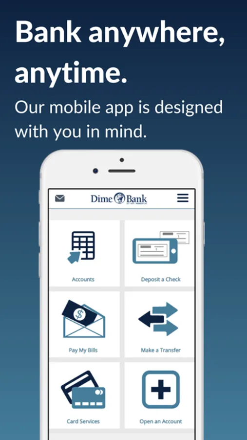 Mobile Banking by Dime Bank (CT/RI) allows you to bank on the go. It’s free to download and offers quick access for managing your accounts. Please refer to your carrier for any data fees that may apply. Check your balances, pay bills, transfer money, and locate ATM’s and branches with just a touch. Our native app is fast, secure, and free. Use your current DimeOnLine login information to start banking today.