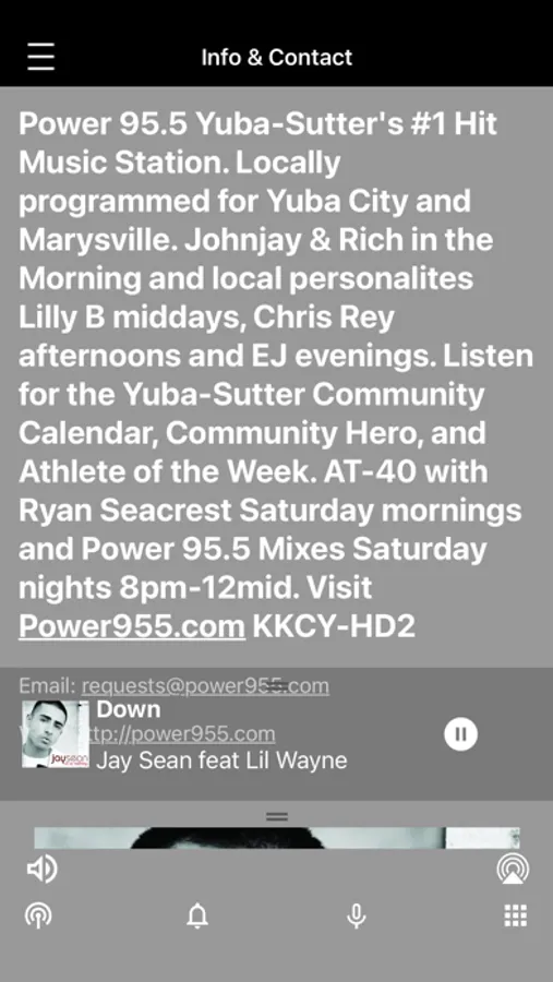 Power 95.5 Yuba-Sutter's #1 Hit Music Station. Locally programmed for Yuba City and Marysville. Johnjay & Rich in the Morning and local personalites Lilly B middays, Chris Rey afternoons and EJ evenings. Listen for the Yuba-Sutter Community Calendar, Community Hero, and Athlete of the Week. AT-40 with Ryan Seacrest Saturday mornings and Power 95.5 Mixes Saturday nights 8pm-12mid. Visit Power955.com KKCY-HD2