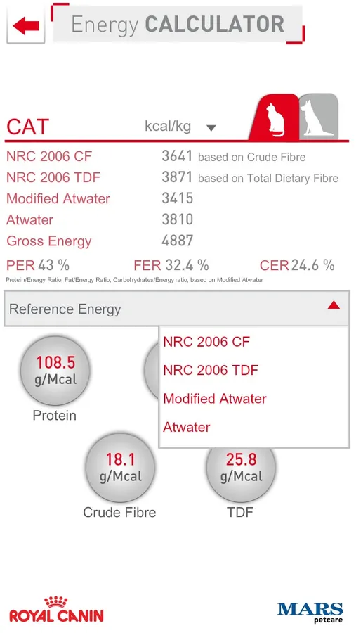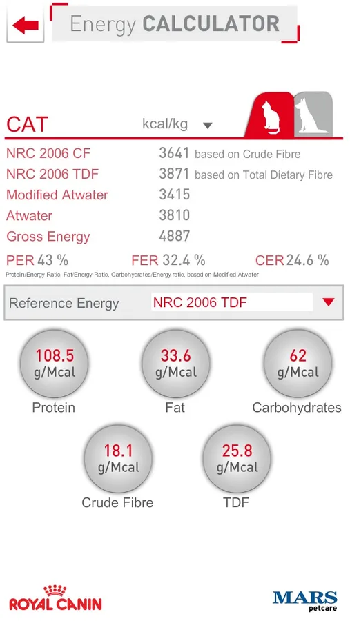 - You obtain the metabolizable energy density estimated according to the NRC 2006* equation (crude fibre and total dietary fibre, cat or dog), the Atwater and the modified Atwater equations as well as the gross energy.