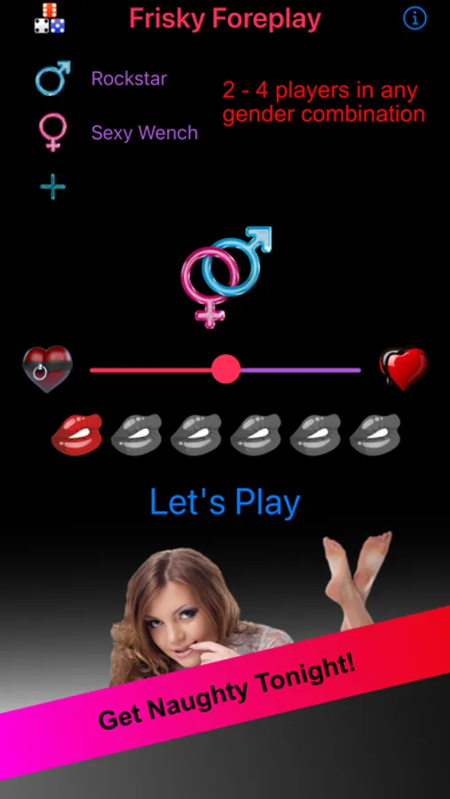 Note: Content presented in the Frisky Foreplay Game is of a sexual nature with intentionally suggestive themes appropriate for adult couples. The application is intended for intimate, loving couples who want to enhance their relationship. It contains textual information only with no nudity. You must be of legal age in your region to use this application and view the sexual material it contains. The full Disclaimer and Terms of Use can be found on our support website.