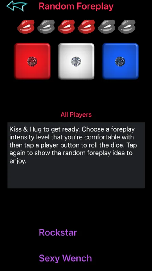 You take turns rolling three dice (colored red, white and blue) and performing an activity. The ordered combination of dice maps to one of the hundreds of unique, gender specific foreplay ideas to enjoy. The red die indicates the intensity level and the white/blue combination points to one of 36 sexy activities in each level.