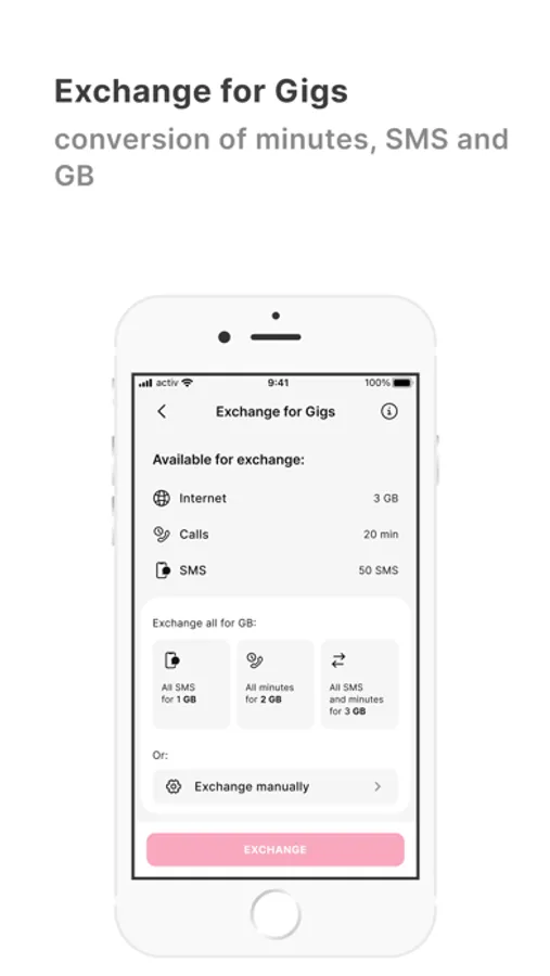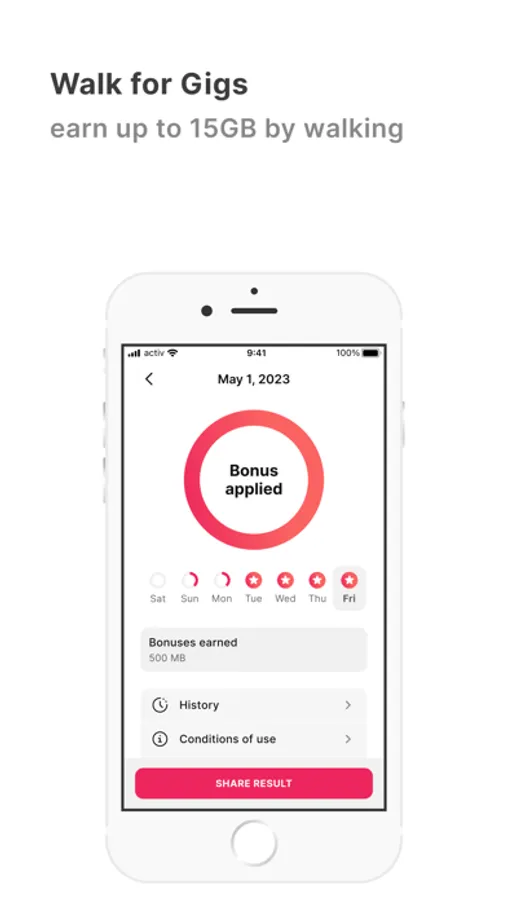 Walk for Gigs is available on the TOP tariffs, allows to receive free internet for walking, 5000+ steps a day = 200MB. activ does not count steps but uses the data from the Health Kit app.