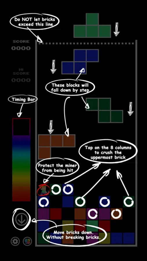 - Tap the Down Arrow to let hanging bricks move down, without miner moving.