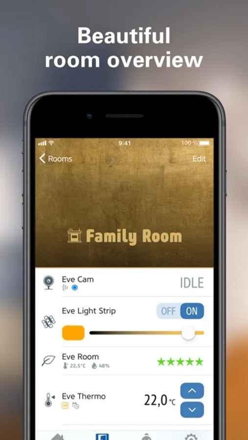 Get a quick overview of everything that's happening in your connected home. Quickly access your favorite scenes to instantly control multiple accessories as one. And dive into room or type details with a simple tap.