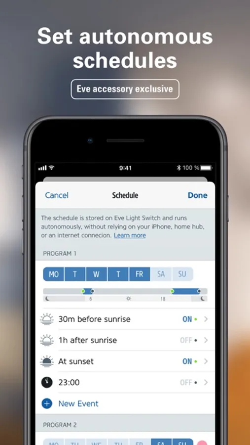 Eve works with all Matter- and HomeKit-enabled devices. See your home at a glance. Customize your ecosystem down to the finest detail. Activate scenes in a snap. And easily create automations using timers and rules. With Eve, you’re at the forefront of connected home control – and guided – every step of the way.