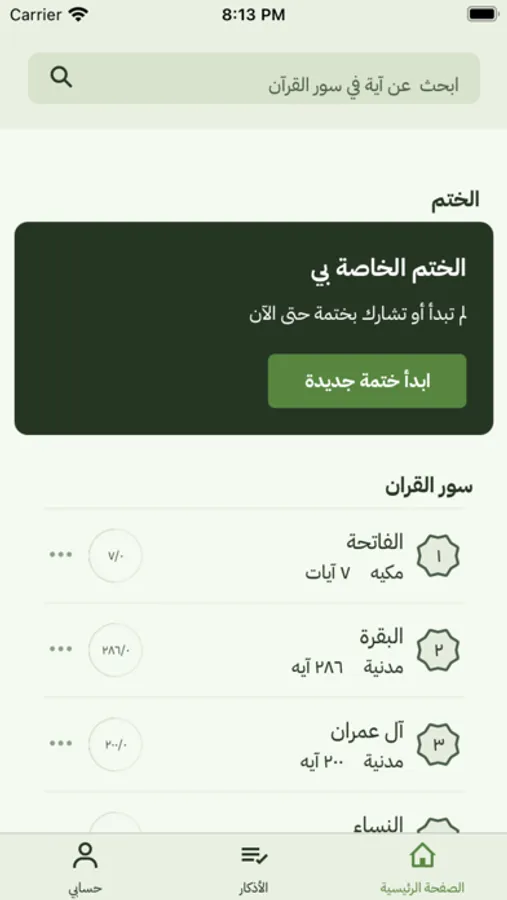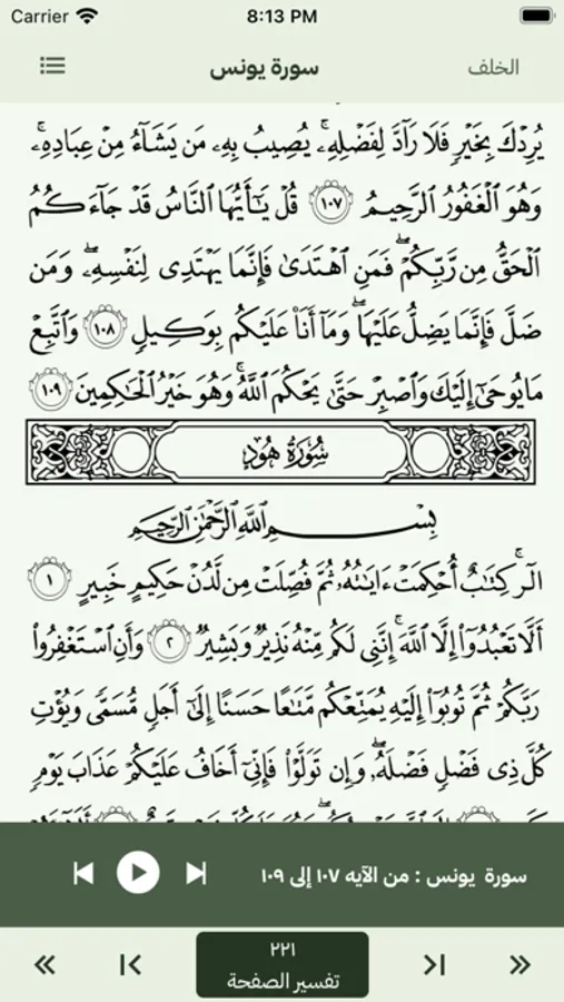2- شرح آيات السورة: حيث يعرض للقارئ الآية وتفسيرها أسفل منها ويمكن للقارئ الاستماع للتفسير صوتياً ويمكنه أيضا تكبير نافذة الآية أو الشرح بالضغط عليها.