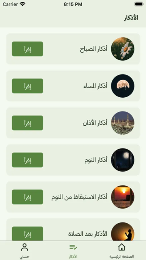 1- التلاوة من المصحف: حيث يتمكن القارئ من تلاوة صفحات القرآن الكريم بالرسم العثماني ويمكن للقارئ حفظ المكان الذي وصل إليه والانتقال إلى قسم الاستماع للاستماع للتلاوة صوتيا.