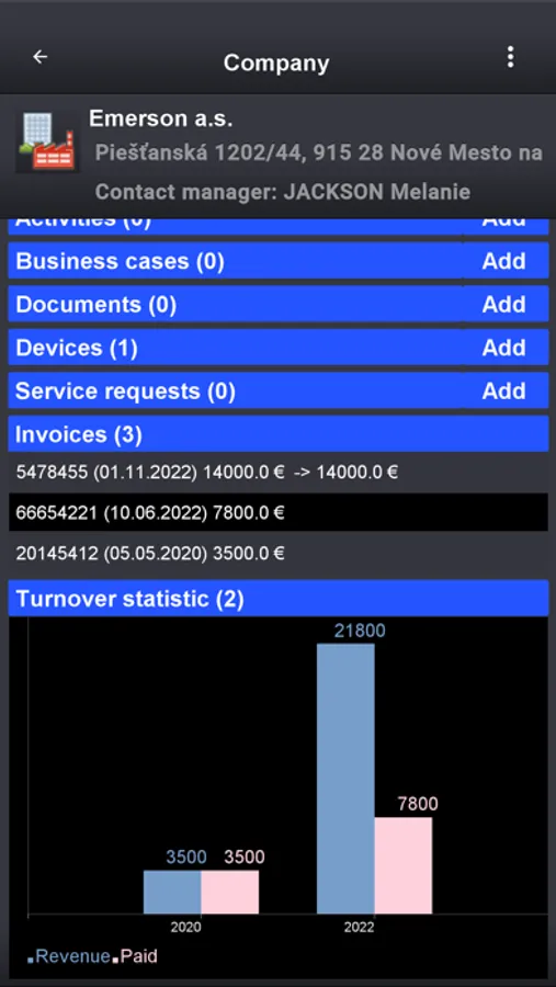• Devices – information about all devices or machines you delivered to your customers. Very important feature for tech companies and suppliers.