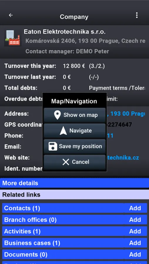 • Contact management – track basic information about your customers, suppliers or other companies and their contacts. See all related information in one view. If the BusinessReport database is integrated with your ERP system, you can see useful financial information about your customers (turnovers, debts, ratings etc.) on your mobile device.