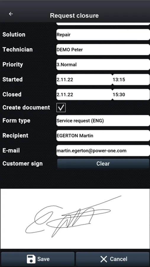 • Service requests – all customer problems in one place. Failures, maintenances, installations or other type of requests. You can close requests with the customer's signature, then create and send PDF work report.