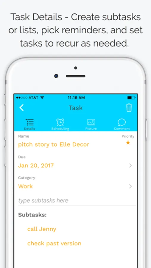 Subtasks - Got a complicated project or a deadline looming? Big trip coming up? Break it into discrete, manageable tasks that will keep you on track.