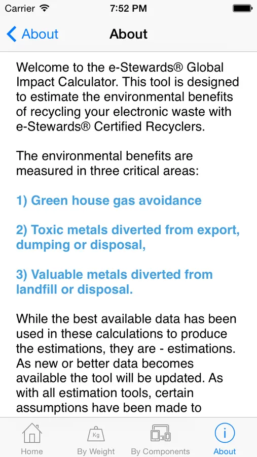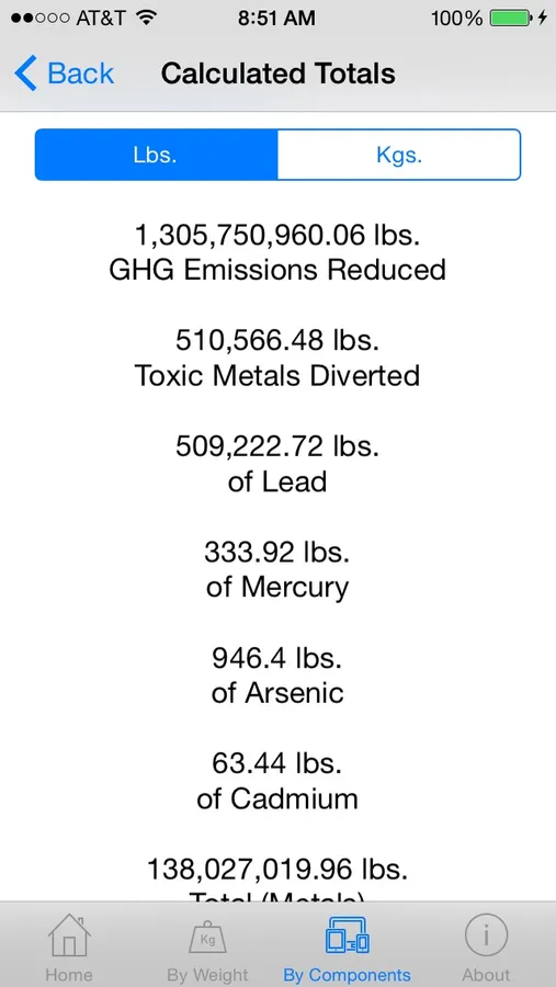 The e-Stewards Global Environmental Impact Calculator (eWaste Calculator) can be used to tell you the actual environmental benefits of using e-Stewards Recyclers. Simply type in the number or weight of total e-Waste or the amount of each type of used electronics you intend to have recycled and the tool will tell you the amount of: