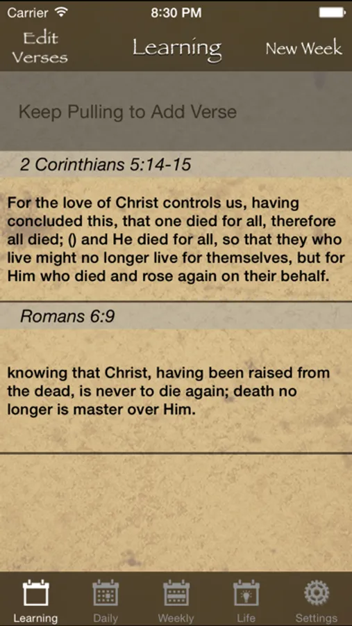 - Add your own verses by pulling down on the table in the "Currently Learning" section