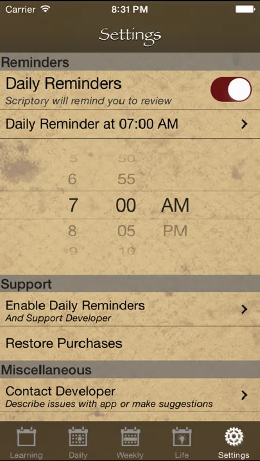 Not only does Scriptory give the user a great experience of memorizing and reviewing scripture, there is also an in app purchase that allows Scriptory to go even further by reminding the user to review their verses at a time they decide is best for them.