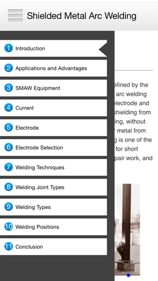 The Shielded Metal Arc Welding (SMAW) app was developed to provide an interactive way to understand the fundamentals of Shielded Metal Arc Welding commonly referred to as “Stick” welding. This app has embedded video, interactive "hot spots", and reading material to explain the fundamentals of Shielded Metal Arc Welding in a fun and engaging way. This app is a learning tool that will engage students and anyone that wants to better understand the fundamentals of Shielded Metal Arc Welding.