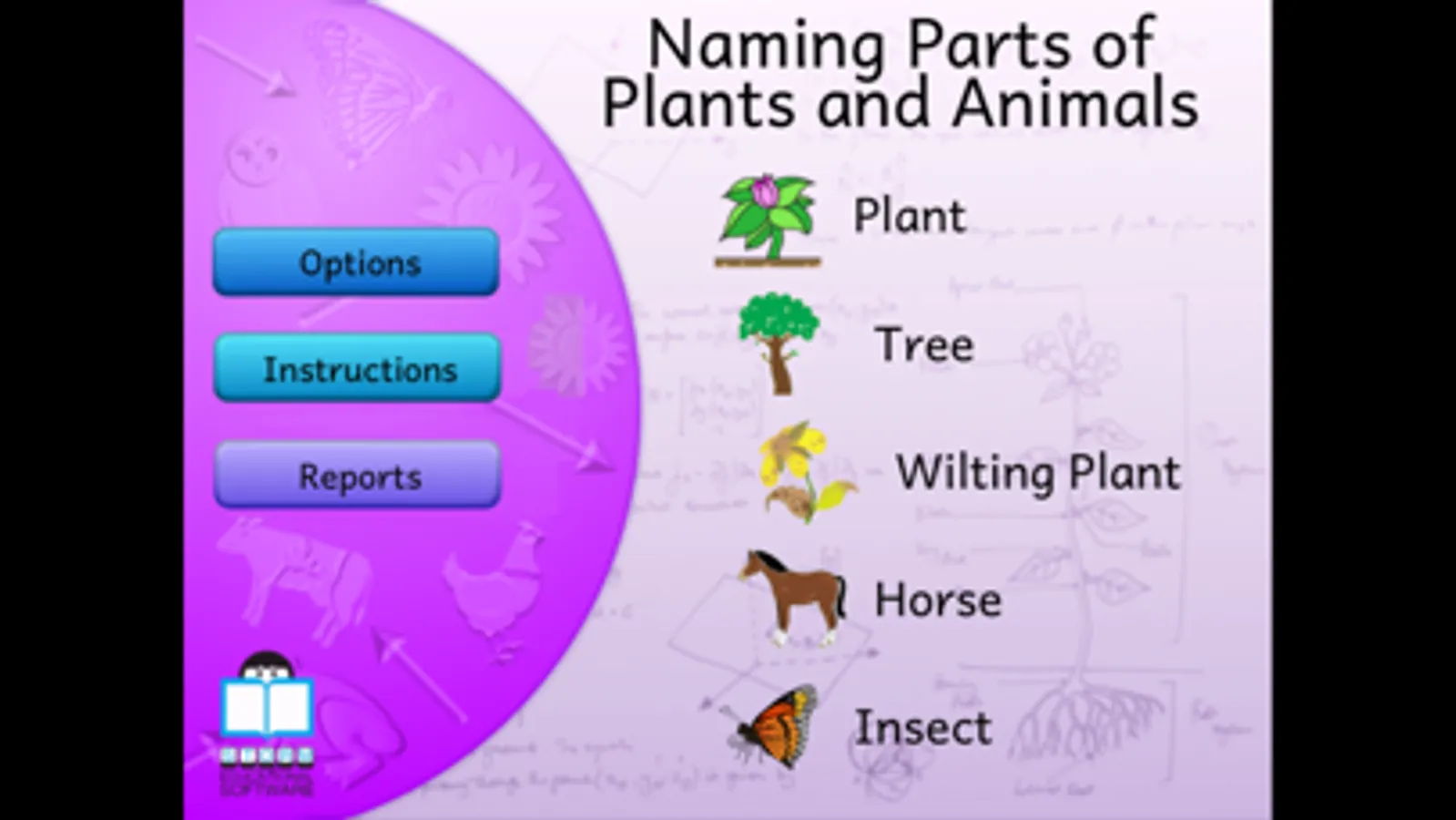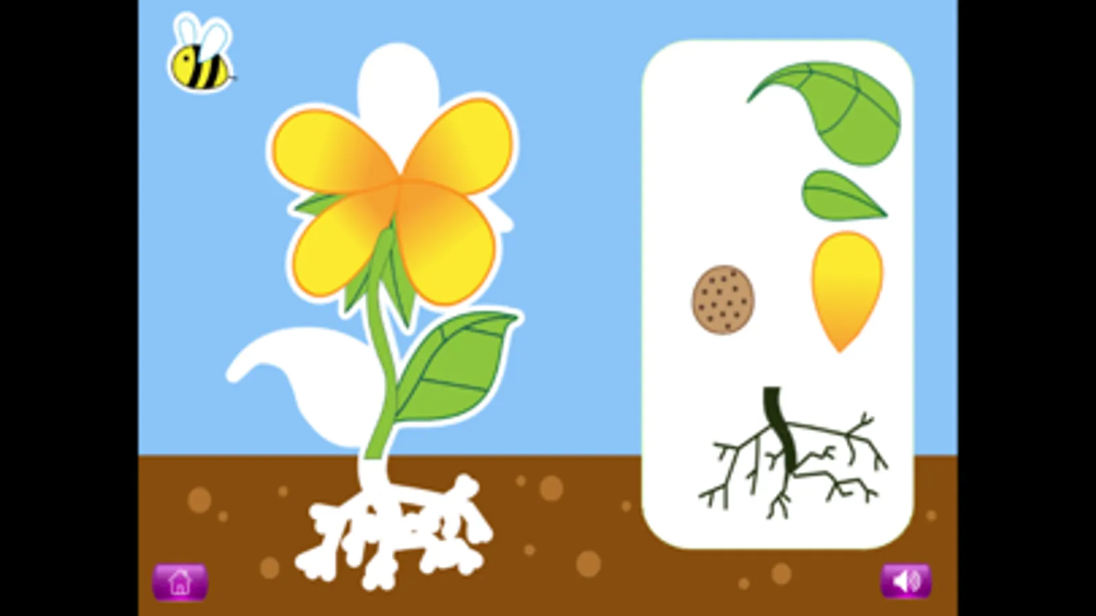 For each of these topics, a picture shown on the screen is completed by dragging the different parts (eg with a flower: petal, leaf, roots, stem etc.) from the right of the screen and placing them into the correct position. When all of the parts have been placed, labels can be added, and children can click on the labels to hear and read more about that part of the plant or living creature.