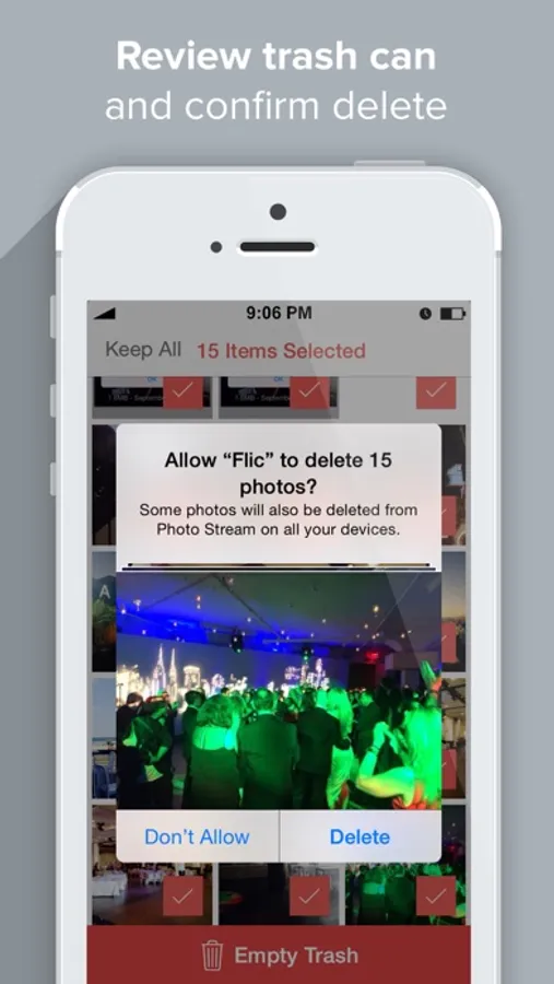With Flic, you can manage all the photos in your camera roll with ease. Take the time and pain out of deleting duplicate photos and poorly lit pictures that take up valuable memory storage space on your phone. Open Flic and scroll through your entire camera roll, one picture at a time. Then swipe left to trash a photo and swipe right to keep it, it’s that simple! Flic even tells you how much memory space you will save from deleting the selected pics.