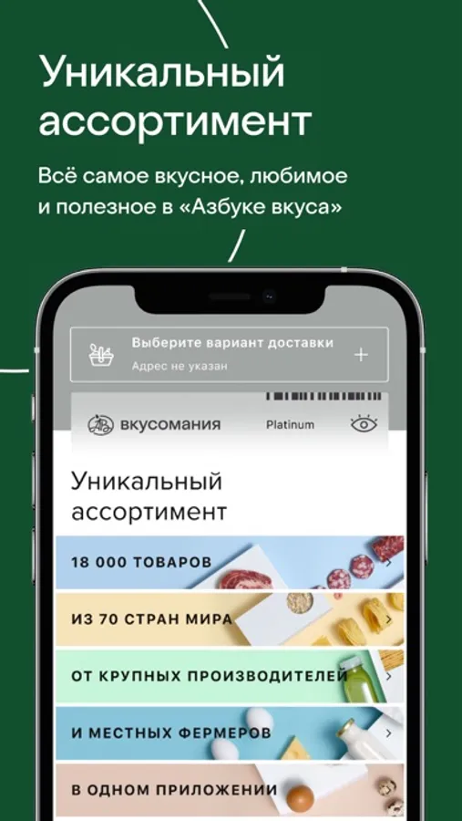 — Большой выбор товаров: 18 000 позиций из 70 стран. Свежие продукты на любой вкус из разных уголков мира для вашего рациона.