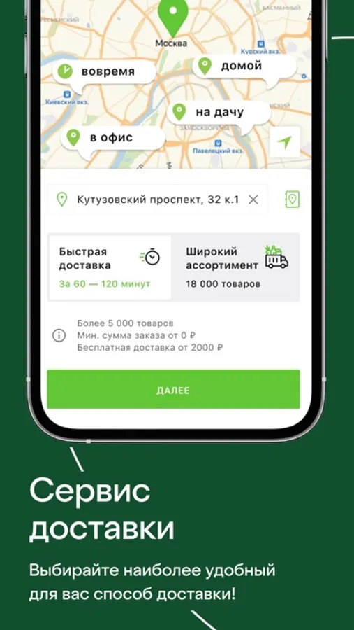 — Доставка продуктов со склада или из ближайшего к вам супермаркета «Азбука вкуса» в любую погоду и без выходных. Также можем привезти заказ в удобный для вас магазин, чтобы вы могли забрать его в нужное вам время.