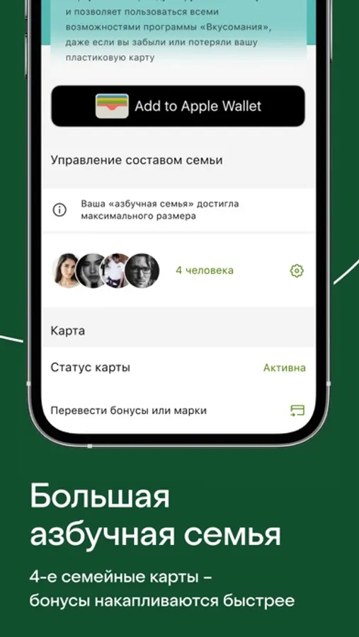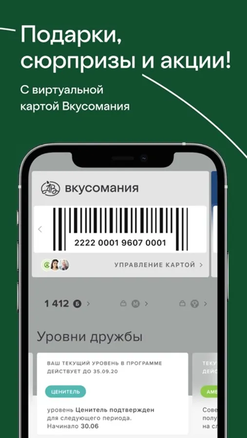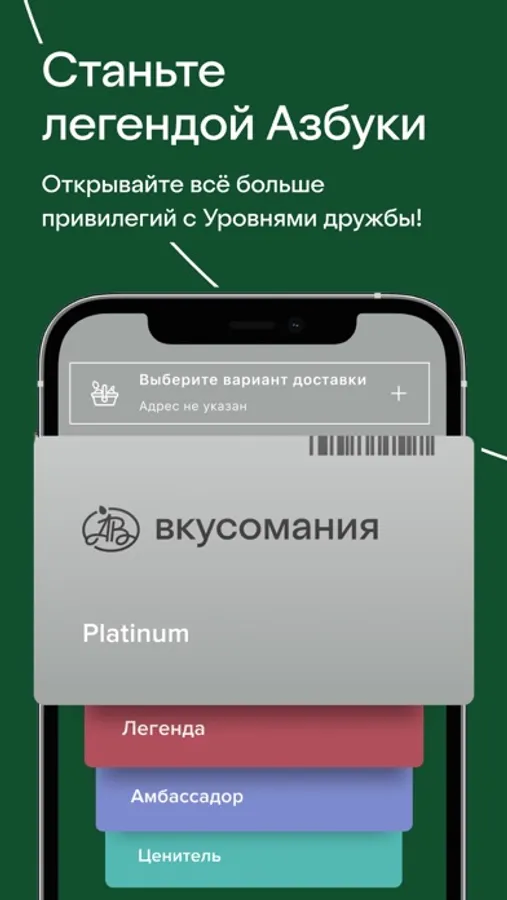 Оформите виртуальную карту лояльности «Вкусомания» в приложении «Азбука вкуса» и получайте бонусы за участие в акциях, викторинах и квестах, за совершение покупок в магазине или при оформлении заказа. Приобретайте за бонусы различные товары, абонементы на завтраки и обеды, на чай, кофе и другие напитки.