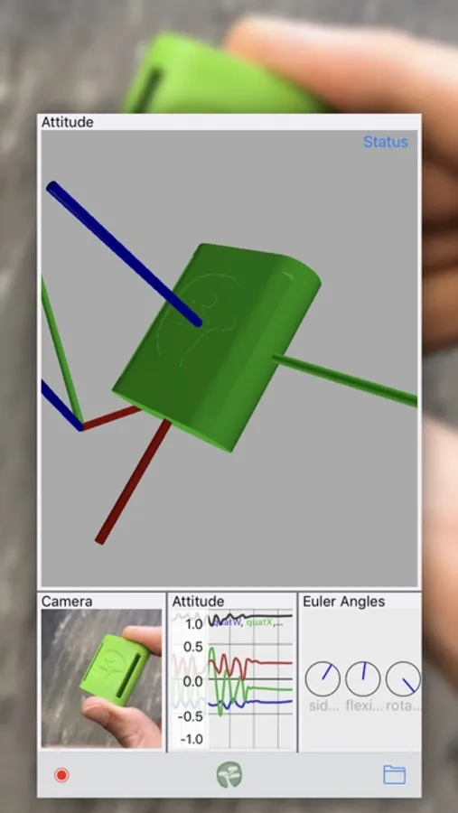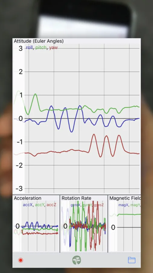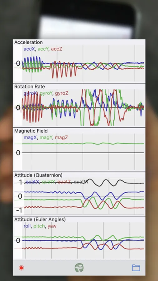 Select among the available data sources and visualization options to freely combine them into your own, saveable configuration. The graph visualization supports different time scales and you can set an upper- and a lower threshold to get visual feedback when one of them is exceeded. The entire screen can be recorded into a video for later analysis and for sharing, and you can save the data streams to CSV files for sensors that support this feature.