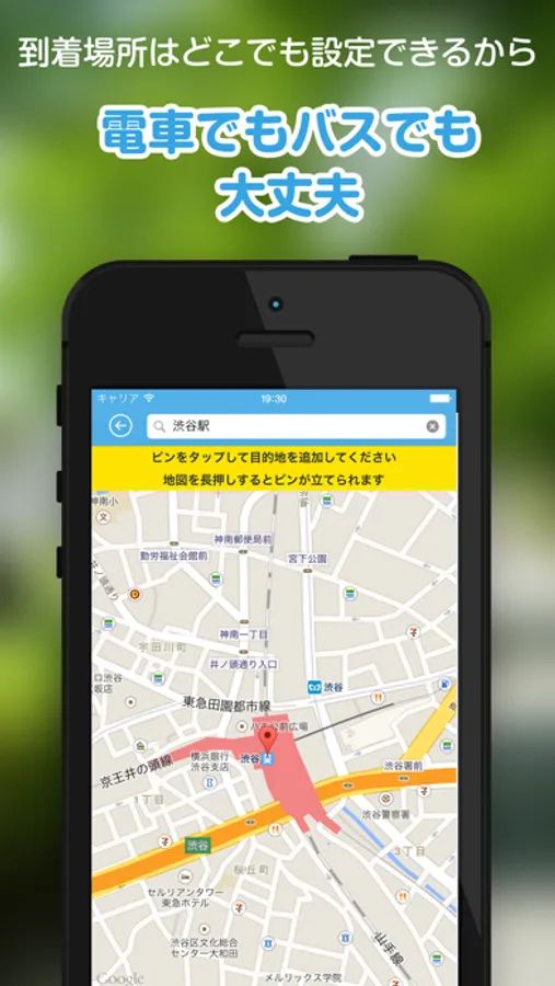 駅名だけではなくバス停なども検索可能なGoogle Mapを使用!任意の地域も目的地として登録出来るため、あらゆる交通手段にもご利用頂けます。