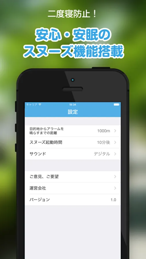 設定項目は次の3点!アラームが鳴り始めるまでの距離、2度寝防止対策のスヌーズ機能の起動時間、アラーム音の変更。