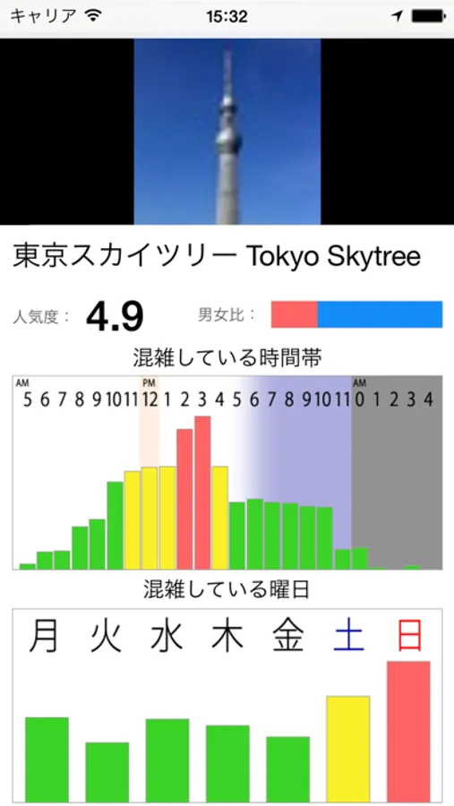 さらに気になるスポットをタップすることで、そのスポットの混雑情報を見ることができます。時間帯ごとの混雑状況、そして曜日ごとの混雑状況がグラフでわかります。住所をタップすると周辺地図と現在地を見ることができます。