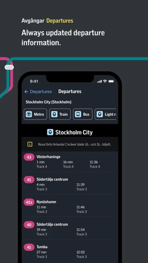 A convenient way to buy tickets for public transport in Stockholm with SL and get live network service updates.